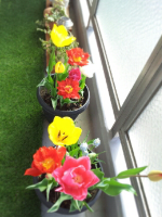 昨秋植えたチューリップとムスカリでベランダがプチお花畑になっています
