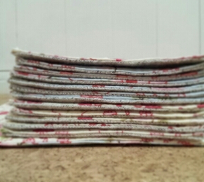 リクエストのコースター10枚。布と布の間にフェルトを挟みました!柄違いを制作中お洗濯できて巾が広い!ウォッシャブルフェルト【110cm巾タイプ・フエルト】価格:81円(税込、送料別)まきんこダイソーで購入