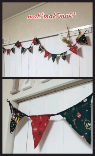 三角フラッグのガーランドを作りました。ひもが黒しかなく布の色も暗め落ち着き過ぎ?白系の布を入れたほうかよかったかも作り方は簡単です好きな三角の大きさに切った布をひもに縫いつけるだけまきんこは布端を二つ折りで縫いましたがボンドや両面テープで貼るか切りっぱなしでも 問題無さそうです。違う布でも作りたい!ブルーミンフラワー パーティフラッグ ガーランド(両面・綿生地)Biscotti ビスコッティ <...価格:3,800円(税込、送料別)