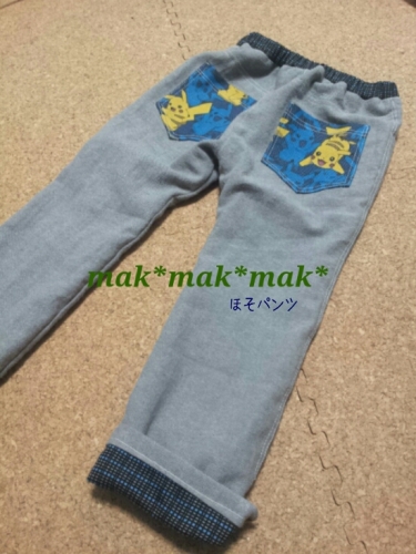 またまたほそパンツ、とうとうサイズ120の型紙を写しました最近、寒い寒いと長ズボンしかはかない息子洗濯が追い付かずしかも昨年作った、ほそパンツ2本の膝に穴あき…まだまだ増産しないといけないようです。今回は薄手の綿麻生地に裏地をニットでつけましたポケットはピカチュー丈はサイズ110にしています。ニットが伸びて裾から出てこないか心配2013年 キャラクター生地 杢ニット生地 ポケットモンスターベストウィッシュ 秋冬におすすめの...価格:199円(税込、送料別)
