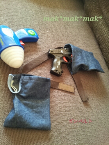 2丁のおもちゃの銃息子がいつもズボンのゴムにはさんで遊んでいたので30分足らずでガンベルト作りました。マジックテープでの脱着昨日のハロウィンでも装着。お菓子をたくさんもらえ大満足な息子でした!昨日のゆびクッキーも好評でしたよ