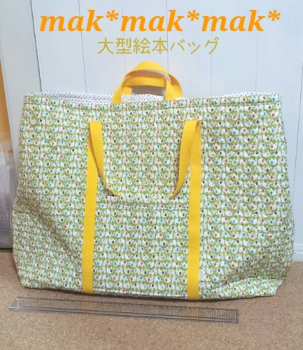 お友達からのリクエスト。お友達のお母さんが幼稚園、図書館などで絵本の読み聞かせをしていて大型絵本を入れるバッグをリクエストされました中と外にポケット1つづつ。縦50cm横62cmマチ14cmかなり大きなサイズです。あまり大きくない絵本の時に少し口を狭められるよう両端にスナップボタンを取り付けました。写真はバッグの前に50cmものさしを置いています。【送料無料】大型絵本>めっきらもっきらどおんどん [ 長谷川摂子 ]価格:10,080円(税込、送料込)【送料無料】 ちびくろ・さんぼ ビッグブック / ヘレン・バンナーマン 【絵本】価格:10,290円(税込、送料込)今年も2月に息子の保育所で生活発表会があります昨年は めっきもらもっきらどおんどん の おたからまんちん でした。今年は ちびくろさんぼの お父さん じゃんぼ だそうです