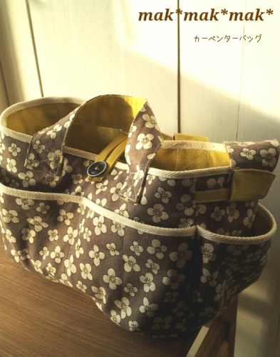 filerさんのカーペンターバッグ(小)作りました。綿麻の花柄と帆布のからし色花柄が少しおばさんぽっくなるかなぁと思っていたらそうでもなく可愛らしい秋冬用のバッグになりました。帆布がしっかりしているので接着芯は使ってません。レシピには内側にポケットがなかったので取り付け、ボタンで取り付けるショルダーベルトは縫いました。ボタンホール4個はめんどくさい、、、中が丸見えなのでバッグを肩にかけて後ろに回すと財布の盗難など怖いと思ったのでファスナーポケットとかつければいいかなショルダー4ポケットカーペンターバッグ(小)型紙価格:840円(税込、送料別)
