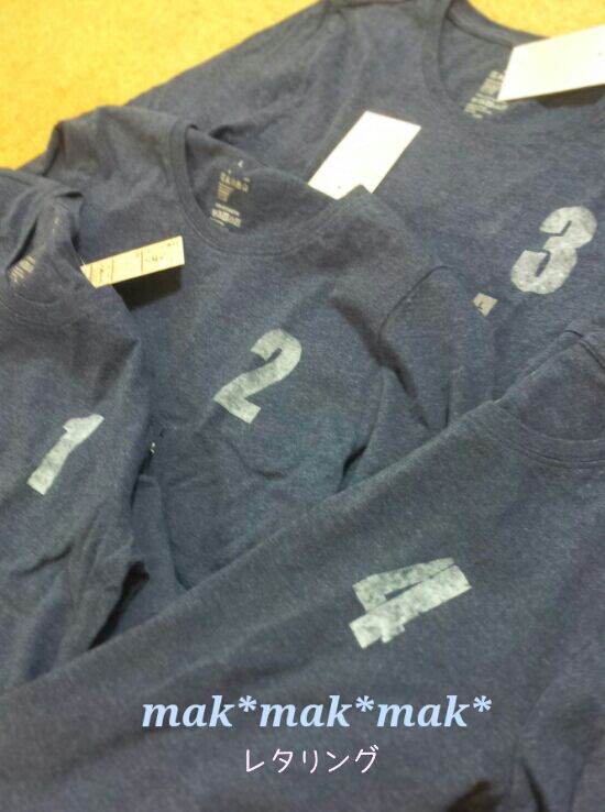 先日の続きで無印良品のネイビー色のロンTに 白色スタンプでレタリングしました。 チームシャツにピッタリです ブログランキングに参加中です! クリックお願いします にほんブログ村