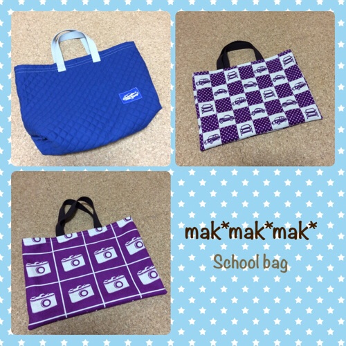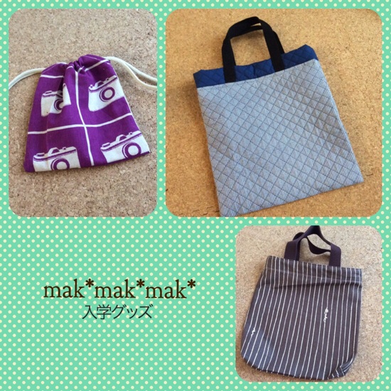 給食袋、キルティングの縦型トートバッグ、くつ入れあとはナフキン1枚だけ。明日持って行く予定 なんとか入学までに間に合いましたにほんブログ村ブログランキング参加中!