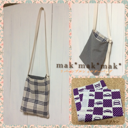 残っていたナフキンを仕上げましたこれで仲良しイトコちゃんの次男くんの入学グッズは完了です!追加でイトコちゃんにペットボトルと財布、携帯電話が入るサイズの斜めがけバッグをリクエストされたのでショルダーバッグをテキトー裁断で30分で作り上げました。リバーシブルですだいたい 幅23cm高さ26cm位。少しだけショルダーの長さ調整もできますブログランキング参加中♩にほんブログ村