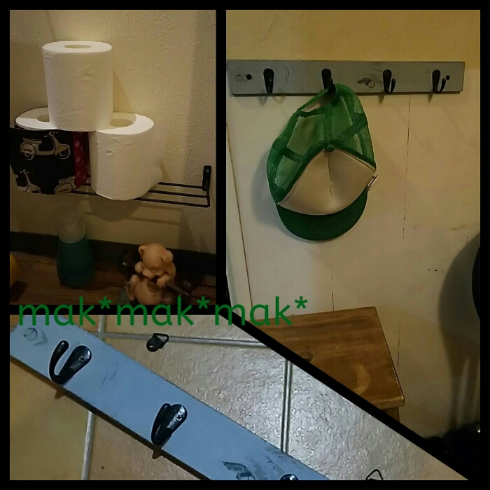 左上、Seriaで購入したインテリアバーをトイレットペーパー置き場に右、左下、Kitchen Kitchenで購入した540円の4連フック、三角カンを外して壁に直接打ち込み、帽子かけにほぼ毎日帽子が行方不明に…家のあちらこちらにフックをかけてますが片付かないのは何故だろうにほんブログ村使い込むほど味が出る!シンプル スチール 4連 フック【RCP】価格:518円(税込、送料別)