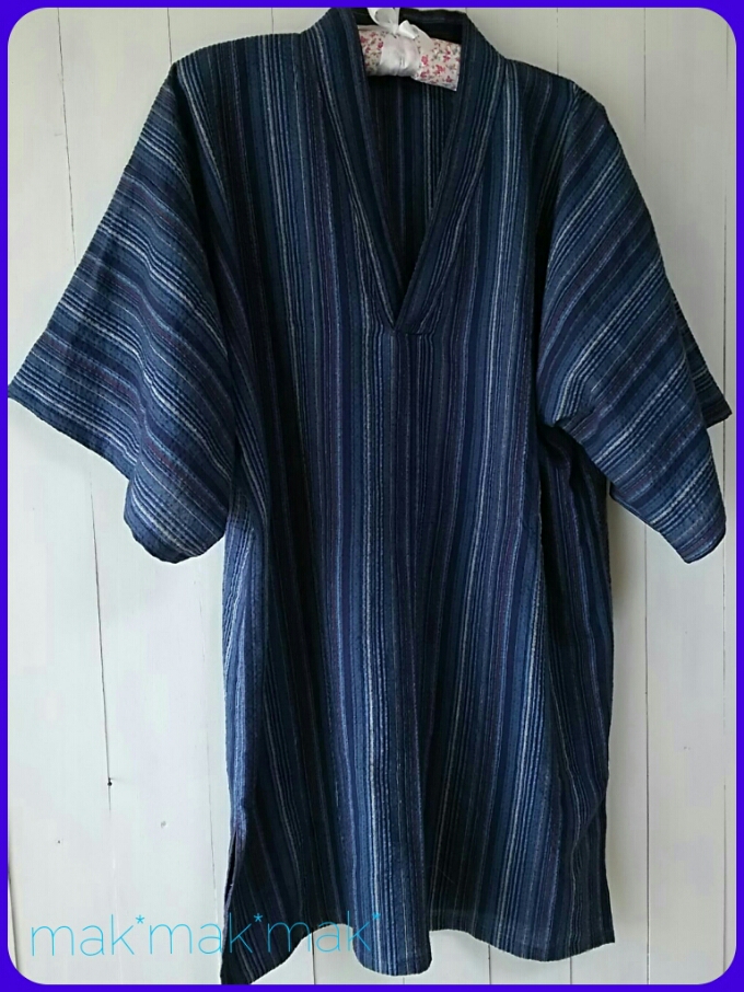 アミポシェさんの かぶり甚平、完成です。メンズサイズL、かなりゆったりしています。心地よい素朴な風合い。しじら織り生地・たて縞(藍色)【RCP】価格:118円(税込、送料別)にほんブログ村