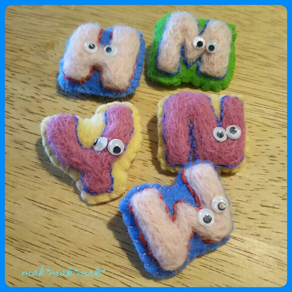 ホワイトデー用にブローチ作りました。5人分。フェルトに羊毛フェルトでアルファベット刺繍糸で文字回りを縫って目玉は接着剤で貼り付けです。ヘアゴムの方がよかったかなー??minneで布小物の販売始めました。訪問おまちしております♥にほんブログ村ブログランキング参加中ですこちらも クリックおまちしています♥