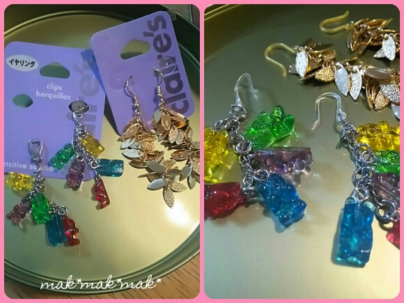 プチプラアクセサリーショップ クレアーズで3個目100円セールをしていたのでまきんこが2個お友達が1個で購入。結局1個500円程で買えました。くまちゃんグミのイヤリングを透明の樹脂フックに変更しました。ゴールドの葉っぱピアスも金属からゴールド風樹脂フックに変更。最近ロングヘアからボブにカットしたのでチラ見するぶら下がりピアスが気になります(*^^*)minneで布小物の販売始めました。訪問おまちしております♥にほんブログ村ブログランキング参加中ですこちらも クリックおまちしています♥