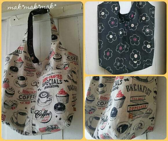 コーヒー柄と花柄のリバーシブル持ち手一体型のバッグです。持ち手の幅は3cm、手にも持ちやすく肩にも掛けやすい太さです。minne登録しました。minne マキマキギャラリーへ訪問おまちしております♥にほんブログ村ブログランキング参加中ですこちらも クリックおまちしています♥
