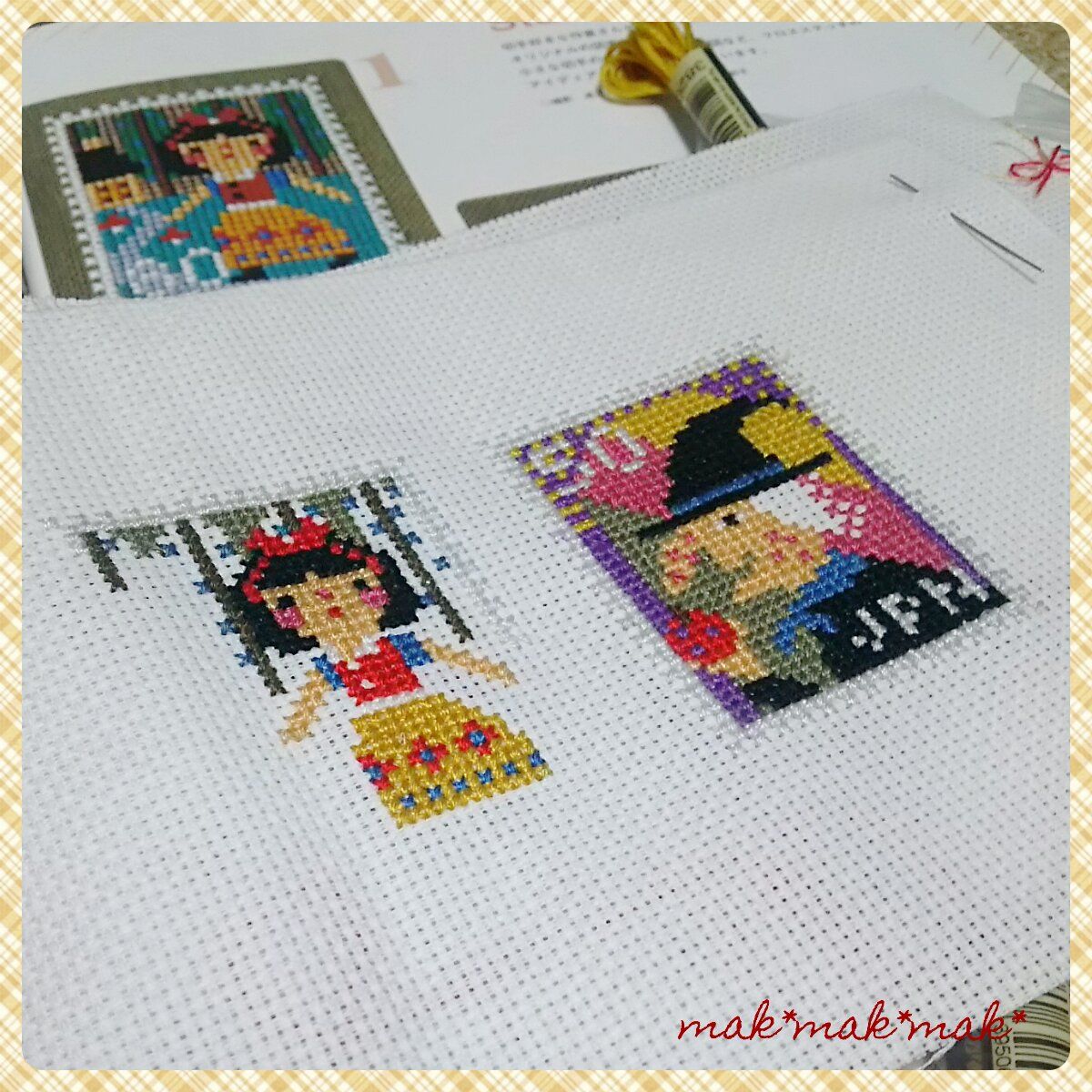 昨日足りなかった2色の刺繍糸を購入し、ついに完成!小屋は結局、オレンジ系の色にしました。布は18ctの白色アイーダ本当は黒色がよかったんですが、黒は14ctしかなかったので切手の周りはメタリックの金糸額に入れて飾ります(*^-^*)実は、白雪姫の鼻、ステッチ順を間違え上側の方向が \ で他と逆になっていますf(^^;気にしない(゚ε゚) にほんブログ村ブログランキング参加中。他の方の素敵な刺繍も見れます☆minneで布小物の販売始めました。訪問おまちしております♥