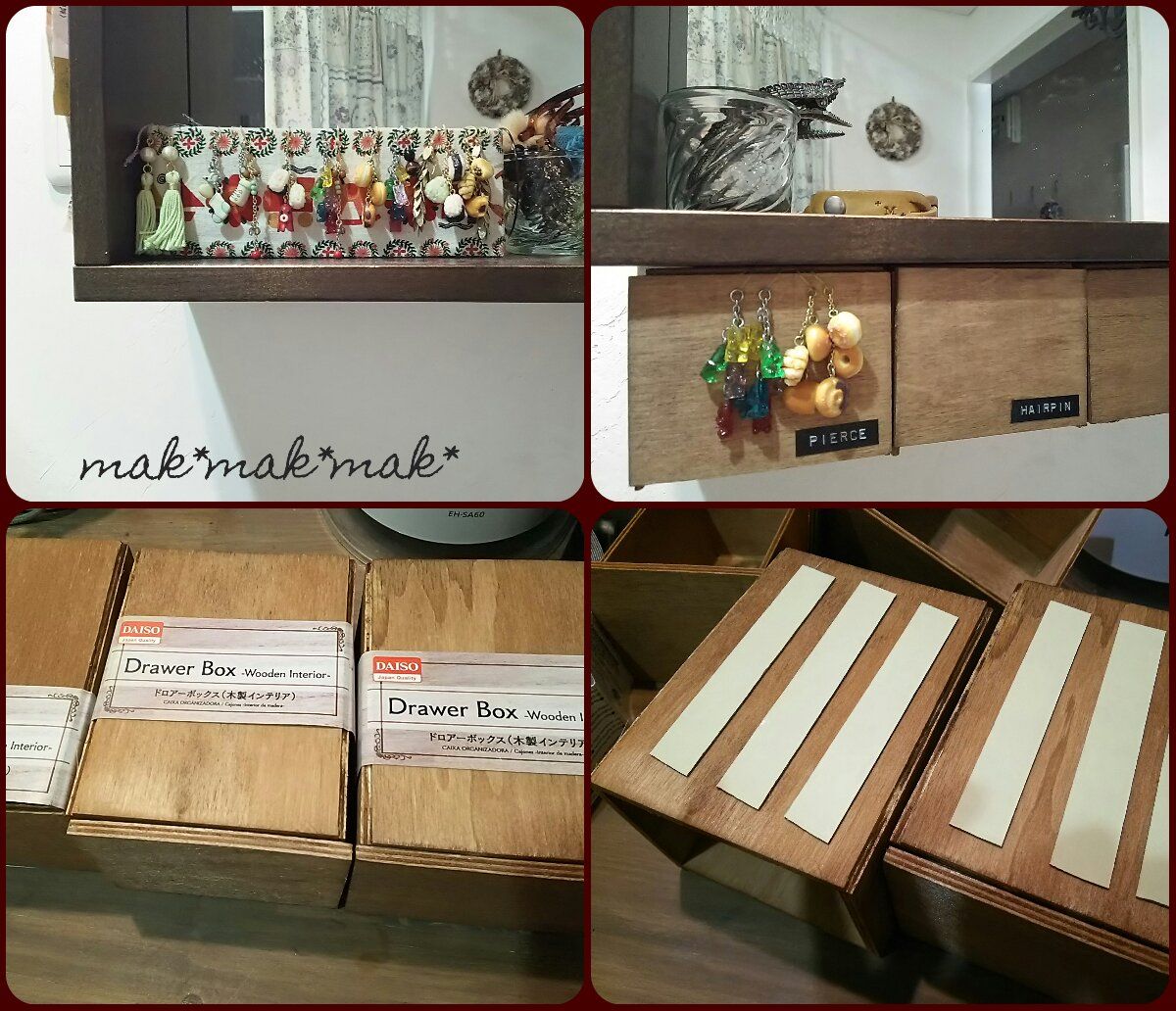 1個108円の小さい引き出し小箱洗面鏡の縁に強力両面テープで貼り付けました。左上がbefore、右上がafter (^w^)まきんこはぶら下がりピアスが好きなのですが特に好きなピアスを引っ掛けられました(^^)ドーナツとパン、おにぎりのピアスはminneでみつけた作家さん、sweet☆ベリーさんにお願いをして作っていただいた物です♥今日はDAISOで3,000円ほど散財ランドリー収納のバッグを購入一番下のは400円でした。幅がぴったり!ただ、もう少し高さがあるとよかったな…また追加で買いに行きます☆にほんブログ村ブログランキング参加中ですクリックおまちしています♥BASEでショップを始めました。Handmade shop マキマキ只今オープン記念で2,000円 以上購入いただくと送料無料(2016年12月31日まで)です。minneで布小物の販売始めました。訪問おまちしております♥