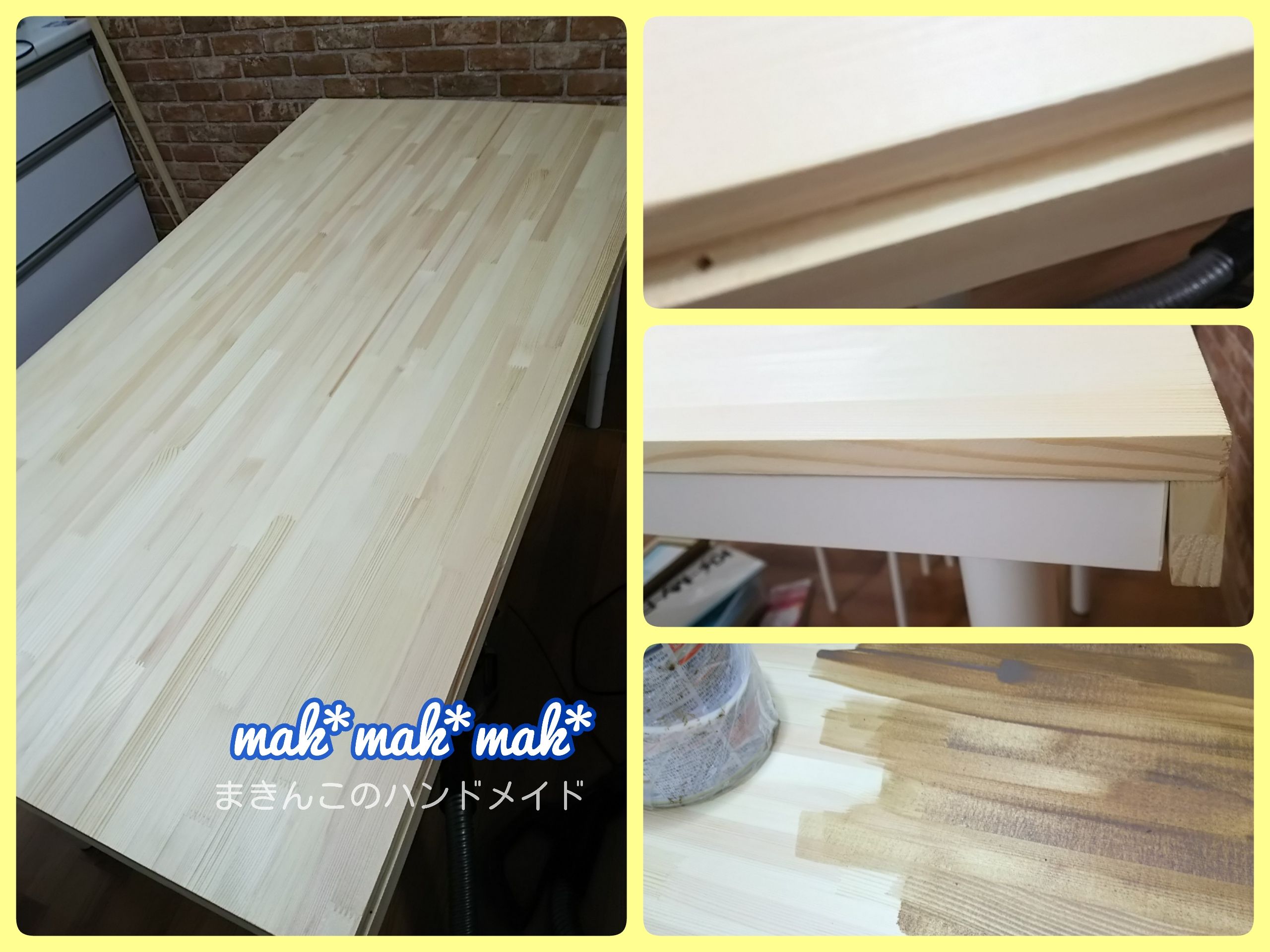 お友達のおうちでDIYしてきました。IKEAのテーブルが白過ぎて嫌なので木目にしたい!という事でホームセンターで12mm厚の集成材をカットしてもらい蓋のようにテーブルにかぶせる事にしました。テーブルの天板と同じサイズにカットしてもらったんですがサイズがあわず側面の板が5mmほどはみ出してしまいました。2mmほど余裕をもってカットしないといけなかったです(T_T)とりあえず側面の片側はまた今度にして色塗りは任せてきましたー。色塗り後の写真は撮れなかったけど少しずつ素敵な部屋に変わってきてます(^^)楽しみ☆ラクマ のまきんこのページはこちら☆minneはこちらどちらにも訪問おまちしております♥にほんブログ村ブログランキング参加中ですこちらも クリックおまちしています♥