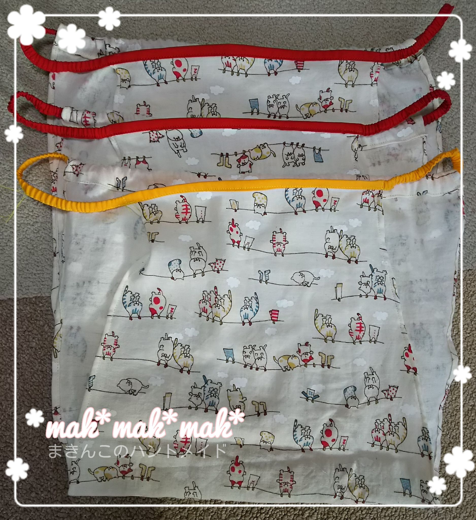 頼まれていたふんどしパンツLサイズ3枚預かりの布で作りました(*^▽^*)柄が上下逆になってもかまわない。と言ってくれたので作ってみたら、柄が逆さまでも気にならないので良かった\(^^)/洗濯されている猫が可愛い(ФωФ)ラクマ のまきんこのページはこちら☆minneはこちらどちらにも訪問おまちしております♥にほんブログ村ブログランキング参加中ですこちらも クリックおまちしています♥