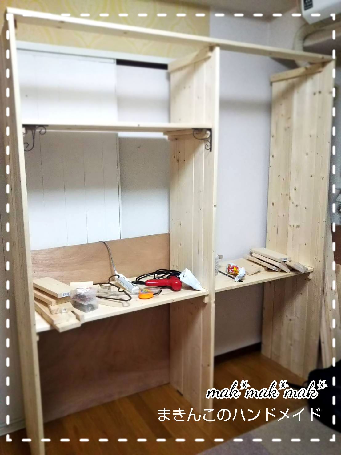休みだった旦那さんが昼間に天板と背板を貼って棚板を1つ取り付けてくれました(^^)ぐらつくから筋交いに板を斜めにいれたよ。右側はデスクトップのパソコンを置くので背板の前に隙間も開けたよ。と報告物をいれると見えなくなるから、いいか(* ̄∇ ̄*)左側の背板部分には使っていない輸入壁紙を貼ろうと仮に設置してみました。ほぼ見えなくなるけど素敵になりそうです( 〃▽〃)右端はエアコンのホースが在るため壁付けはできません。その隙間は掃除機置き場にしちゃいます♪ダイソーでステインを2本買ってきたので今度は着色しちゃいます!足りない板を買いに行くのは来週に。。ホームセンターへは自転車で片道15分ほど、体力がいります(*_*)まきんこのハンドメイドショップ ラクマ⬇https://fril.jp/shop/ma_ki_ma_kiminneはこちらどちらにも訪問おまちしております♥にほんブログ村ブログランキング参加中ですこちらも クリックおまちしています♥