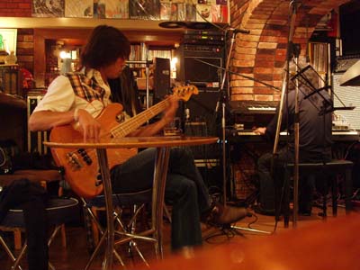 3連休の半分は仕事だったが、昨日の夜は鶴見のライブハウスでライブ後セッション会があるとのことで、出かける予定でいた。ところが、ライブはメンバーの体調不良により急遽中止。直前の告知にもかかわらず、お客さんはちゃんとチェックしていてほとんど来なかったので、ハナから少人数のセッション大会だったのだ!後ろ向きでキーボードを弾いているのが店長のパウロさん。この角度からはなかなか見られないよね。ってか、いつの間にこんな写真を(^^;ちなみに、、all photo by プログレ好きのお姉さん。ギターは近所のNくん。ドラムはいつものアエバさん。みんな楽しそう♪この日、アエバさんが、「こんな曲やりたいんだよ」とCDを持ってきたので早速聞いてみた。どっへー!!!な難曲ばかり!!でもカッコイイ!頑張ってみますかぁ(^^)