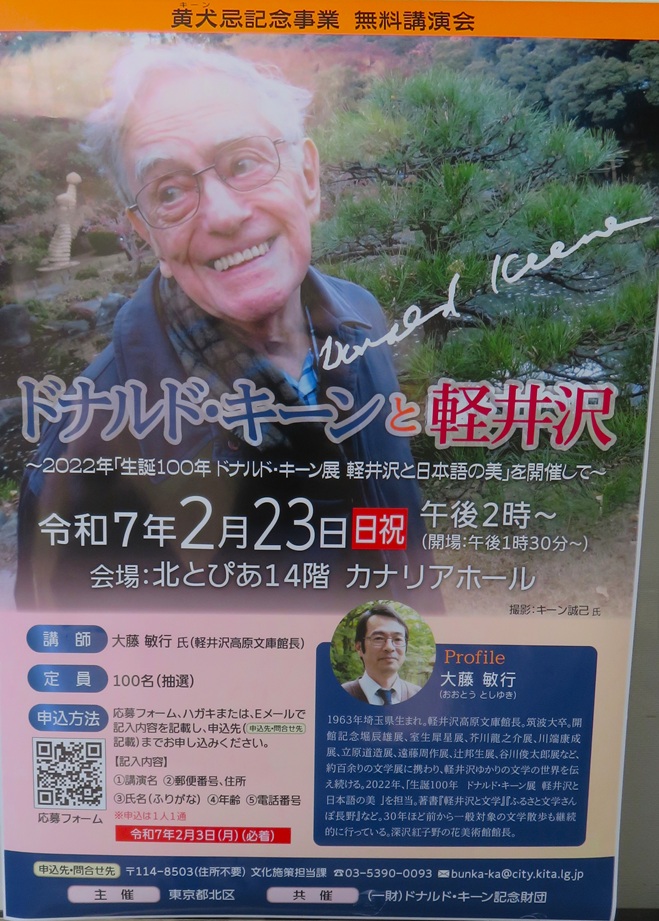 黄犬(キーン)忌記念講演会「ドナルド・キーンと軽井沢 ~2022年『生誕100年ドナルド・キーン展 軽井沢と日本語の美』を開催して~」が、2025年2月23日(日)、東京・北区の北(ほく)とぴあで開催されました。 主催は、北区。 2月24日は、アメリカ出身で日本国籍を取得した日本文学研究者・文芸評論家・コロンビア大学名誉教授のドナルド・キーン氏(1922-2019)の命日。 その軽井沢での執筆活動について、キーン氏と親交のあった軽井沢高原文庫館長・大藤敏行(おおとうとしゆき)氏が思い出とともに語るという内容でした。 また、キーン氏の養子で、一般財団法人ドナルド・キーン財団代表理事のキーン誠己(きーんせいき)氏からも、開会あいさつや質疑応答の中で、キーン氏の貴重なエピソードが語られました。 小説家や歌人など、ひとりの文学者に特化した講演会は毎回楽しみにしています。 お話しがあったことのごく一部を記録しておきます。 ・ 冗談での当て字が好き。 黄色や犬が好きだったので、「黄犬」と書いて「キーン」と読ませた。・ 96歳で亡くなった。 1965年から2017年までの53年間、軽井沢の10坪の別荘というよりは庵(いおり)・山小屋で過ごした。 長いときは、3か月ほど滞在した。 森の中の散歩や、かつてあった西武百貨店などでの買い物によく出かけた。 自炊が多いが、週に1回は外食をしていた。・ 軽井沢に別荘を持つなど、ゆかりの文学者には、有島武郎(ありしまたけお)・正宗白鳥(まさむねはくちょう)・野上弥生子(のがみやえこ)・室生犀星(むろうさいせい)・川端康成(かわばたやすなり)・堀辰雄(ほりたつお)・中村真一郎(なかむらしんいちろう)・福永武彦(ふくながたけひこ)・遠藤周作(えんどうしゅうさく)・安部公房(あべこうぼう)・辻邦生(つじくにお)・北杜夫(きたもりお)・加賀乙彦(かがおとひこ)らがいる。・ 東京・北区西ヶ原の自宅マンションに近い、バラで有名な旧古河庭園(きゅうふるかわていえん)や、昔ながらの霜降銀座(しもふりぎんざ)商店街などに、よく出かけた。・ (配布資料の『軽井沢の庵』(ドナルド・キーン)から一部を抜粋) 「当時、『徒然草』の英訳をしていたので、僧侶か世捨て人のような生活だった。 毎日一日中『徒然草』の翻訳に没頭し、段々自分は著者の兼好法師ではないかと錯覚した。」 「軽井沢のなにが一番好きと聞かれたら、涼しさを決して忘れはしないが、やはり森の中に楚々と佇んでいる私の〝庵〟である。 夏に息子と住むようになってもう3年になるが、二人が生活するには非常に狭い。 しかし、太陽が緑の葉の上に光る時、世界でこれより美しい景色はない、と大都会で育った私は多少大げさに言う。」 2025年1月から、埼玉県熊谷市にあるシェア型書店「太原堂(たいげんどう)」における棚オーナーのひとりとして参加し、「虹色書店」の屋号で、好きな本の販売を始めました。 棚オーナーの皆さんや、お客様との交流によって、本と読書の世界を広げていきたいと考えています。 どうぞ、よろしくお願いいたします。 「太原堂」の公式ホームページは、こちらです。 ⇒ 「太原堂」 楽天ブログやSNS投稿をごらんいただいている皆様、いつもありがとうございます。 ⇒ 楽天ブログ「虹色のはるかな道 ~子どもの頃から好きだったこと~」 記事一覧 私の小さな旅や散歩、鉄道、読書、音楽、映画、特撮・怪獣、子どもの遊び、時事問題、各種講演会・セミナーの参加報告、そして、「13トリソミー」で生まれ0歳5か月でお空へと還っていった天使の拓海くんなどについてのフォトエッセイ『虹色のはるかな道』シリーズの最新刊『四季のお散歩旅 ~虹色のはるかな道6~』の紙の本が、Amazonに続いて、楽天ブックスでも発売になりました。 なお、Amazonでの電子書籍(kindle本)の発売につきましては、後日、お知らせします。 拙いものではありますが、ご興味がございましたら、どうぞよろしくお願いいたします。 ⇒ Amazonで販売 『四季のお散歩旅 ~虹色のはるかな道6~』 ⇒ 楽天ブックスで販売『四季のお散歩旅 ~虹色のはるかな道6~』私のInstagramは、こちらです。→ 友永孝浩 Instagram Facebookは、こちらです。→ 友永孝浩 Facebook Amazonでの紙の本→ 『雑誌感覚 ~虹色のはるかな道5~』 楽天ブックスでの紙の本→ 『雑誌感覚 ~虹色のはるかな道5~』 なお、Amazonでのみ販売されている電子書籍は、kindleという無料アプリをパソコンやスマホにダウンロードすれば、購入後、直ちに自身のライブラリに保存され、いつでも読むことができます。 文字や画像の拡大もOKです。 紙の本とはまたちがう味わいがあるかと思いますので、初めての方も、ぜひ電子書籍の世界を気軽にのぞいてみてください。 Amazonでの紙の本と電子書籍 → 『青空と白い雲の彼方 ~虹色のはるかな道4~』 楽天ブックスでの紙の本→ 【POD】青空と白い雲の彼方 虹色のはるかな道4 [ 友永 孝浩 ] 愛と幸せをたくさんくれた孫の拓海くんについては、感謝をこめて、『天国の拓海くん 幸せをありがとう ~虹色のはるかな