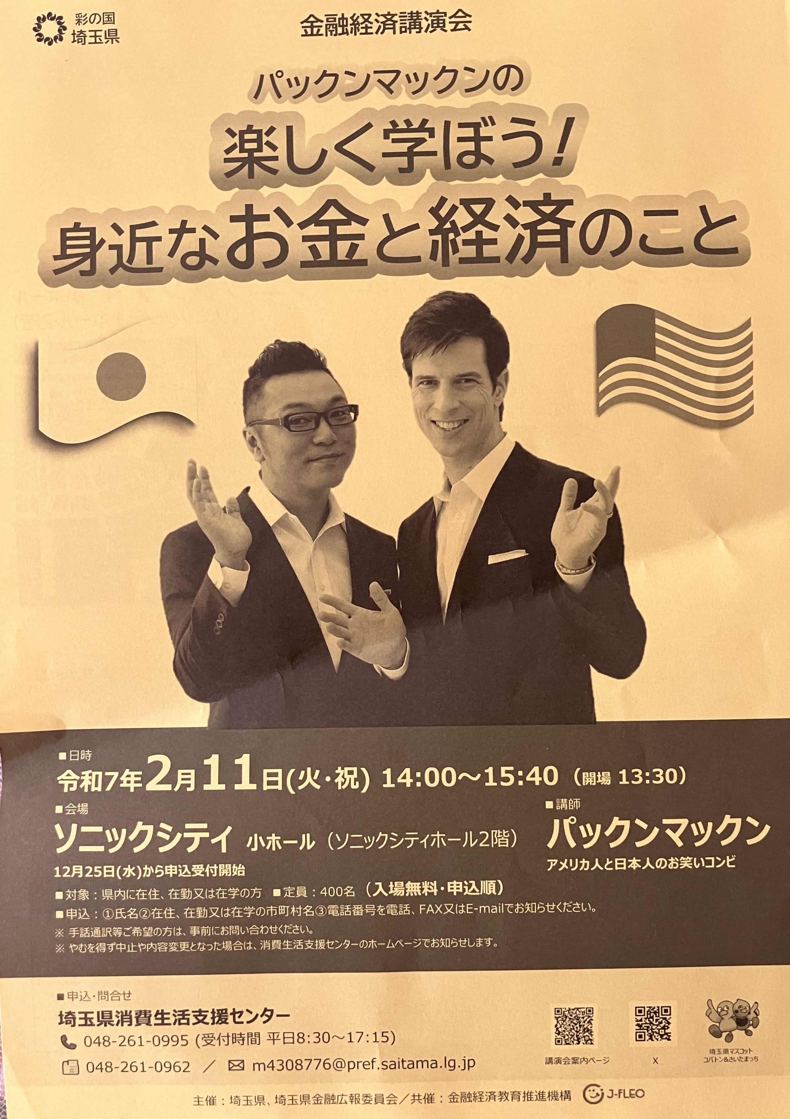 金融経済講演会「パックンマックンの『楽しく学ぼう!身近なお金と経済のこと』」が、2025年2月11日(火)、さいたま市大宮区のソニックシティホールで開催されました。 主催は、埼玉県(消費生活支援センター)と埼玉県金融広報委員会。 「テレビでもおなじみ、お笑いコンビのパックンマックンを講師に迎えし、お金にまつわるあれこれ、入手方法や使い道、節約、貯め方、増やし方などについて、日米のお笑いコンビならではのユーモア溢れる掛け合いで、楽しく学ぼう。」という趣旨でした。 パックン(パトリック・ハーラン氏)と、マックン(吉田眞 氏)のコンビは結成28年。 テレビなどでのコントや声優のほか、近年は講演活動も精力的に。 ネタの発案は主にマックン。 マックンは、英会話をマスターし、アメリカ公演も成功しているそうです。 パックンがボケ、マックンがツッコミ。 それだけで、とても楽しいのですが、壇上で一方的に話すのではなく、客席をまきこんでの進行に。 最初は、近くの席の人とペアを組んでの対話。 対面によるコミュニケーションを大切にということで、自己紹介や夢を語りあう5分間は、あっという間に終わりとなりました。 メインテーマのお金と経済の話しも、おふたりが質問し、客席まで何回も降りてきて、来場者に答えてもらったりしていました。 バックの説明用スライドには、おもしろい写真(たとえば、年代別に並べたパックンの顔は、将来(老後)も今と同じ?)がたくさん含まれていて、笑いを誘っていました。 本題の中では、次のようなお話しがありました。・ 日本の子どもは、お小遣いをもらう。 アメリカの子は、家事などのお手伝いで、お金が入る。・ 世界にはおもしろい仕事がある。 ワニと闘う「クロコダイルレスラー」。 インドネシアでは、渋滞対策として、3人いれば優先的に使える車線がある。 「乗り合い人」は、相乗りすることで収入を得る。 しかし、渋滞は解消していない。 「泣き屋」は中国などでの葬儀に雇われて号泣する人。 派手に泣くと喜ばれる。・ アメリカには学習塾がない。 教育の場は1か所でいいと。 (入学するための受験戦争の有無のちがいだと思われます。)・ お金を増やすため、日本では、こつこつ貯金が主流であった。 アメリカでは、お金を使って収入を増やすことが一般的。・ 「72の法則」年利(%)×年数=72。 式の「年利(%)」に複利法(受け取った利息をそのまま元本に追加して再投資)での年利率を入れると元本が2倍になるのに必要な年数がわかる。 逆に、「年数」に運用年数を入れると元本が2倍になるのに必要な年利が求められる。・ 悪質商法など、消費生活で困ったときには、近くの消費生活相談窓口につながる「消費者ホットライン 188番(いやや)」にお電話を。 ※ 経済や社会について広く楽しく語られる、おふたりの講演を聴講していて、これだけのパフォ-マンスが可能なのは、やはり、日頃の鍛錬と努力の賜物なのだろうと感銘を受けました。 2025年1月から、埼玉県熊谷市にあるシェア型書店「太原堂(たいげんどう)」における棚オーナーのひとりとして参加し、「虹色書店」の屋号で、好きな本の販売を始めました。 棚オーナーの皆さんや、お客様との交流によって、本と読書の世界を広げていきたいと考えています。 どうぞ、よろしくお願いいたします。 「太原堂」の公式ホームページは、こちらです。 ⇒ 「太原堂」 楽天ブログやSNS投稿をごらんいただいている皆様、いつもありがとうございます。 ⇒ 楽天ブログ「虹色のはるかな道 ~子どもの頃から好きだったこと~」 記事一覧 私の小さな旅や散歩、鉄道、読書、音楽、映画、特撮・怪獣、子どもの遊び、時事問題、各種講演会・セミナーの参加報告、そして、「13トリソミー」で生まれ0歳5か月でお空へと還っていった天使の拓海くんなどについてのフォトエッセイ『虹色のはるかな道』シリーズの最新刊『四季のお散歩旅 ~虹色のはるかな道6~』の紙の本が、Amazonに続いて、楽天ブックスでも発売になりました。 なお、Amazonでの電子書籍(kindle本)の発売につきましては、後日、お知らせします。 拙いものではありますが、ご興味がございましたら、どうぞよろしくお願いいたします。 ⇒ Amazonで販売 『四季のお散歩旅 ~虹色のはるかな道6~』 ⇒ 楽天ブックスで販売『四季のお散歩旅 ~虹色のはるかな道6~』私のInstagramは、こちらです。→ 友永孝浩 Instagram Facebookは、こちらです。→ 友永孝浩 Facebook Amazonでの紙の本→ 『雑誌感覚 ~虹色のはるかな道5~』 楽天ブックスでの紙の本→ 『雑誌感覚 ~虹色のはるかな道5~』 なお、Amazonでのみ販売されている電子書籍は、kindleという無料アプリをパソコンやスマホにダウンロードすれば、購入後、直ちに自身のライブラリに保存され、いつでも読むことができます。 文字や画像の拡大もOKです。 紙の本とはまたちがう味わいがあるかと思いますので、初めての方も、ぜひ電子書籍の世界を気軽にのぞいてみてください。 Amazonでの紙の