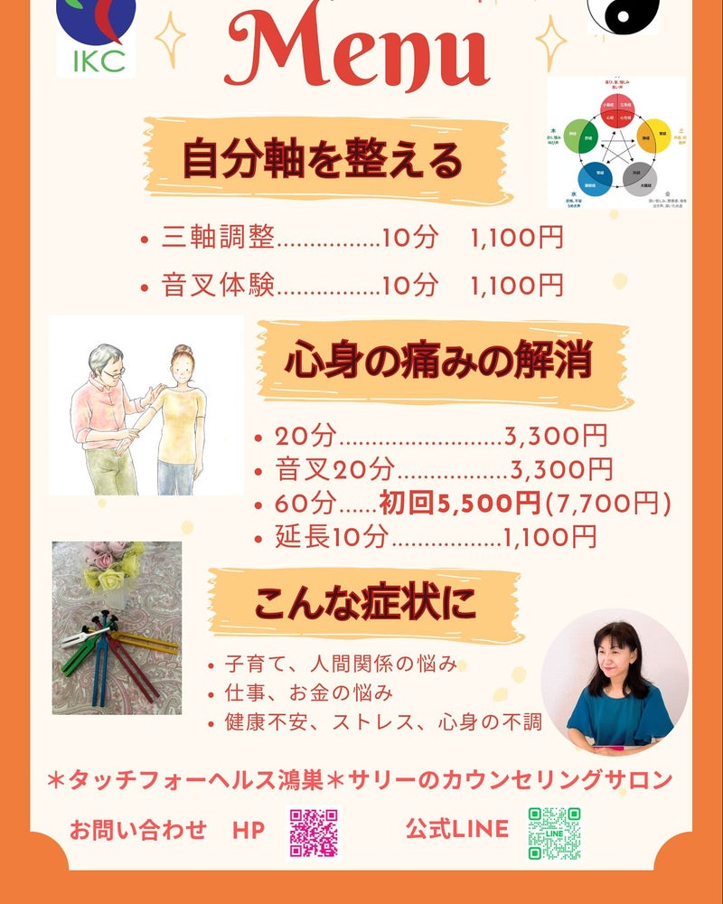 妻のブログです。 子育てやタッチフォーヘルスについての講座など、用意しているメニューを一覧にして、よりわかりやすくしました。 対面とオンラインの両方で対応できますので、お気軽にご連絡ください。 ⇒ 子育てやタッチフォーヘルスのメニューを一覧にしました サリーのカウンセリングサロンでは、様々なメニューをご用意しています。 体験会に参加していただいて、タッチフォーヘルスを知っていただいたり、子育て講座に参加したい方には、リアルとオンラインなどの講座もご用意しております。 ご興味のある方は、お問い合わせいただければ日程の調整もさせていただきます。 ご家族皆さんの健康と幸せのために、一家に1人タッチフォーヘルスという思いで、活動しています🍀 どうぞ、ご参考にしてみてください😊 カウンセリングについてどんなことをするのか知りたい方には、無料説明会も開催しています。 お申し込みはこちらから⬇️ お問い合わせは、公式LINEや、HP、メールなどご利用ください。 公式LINEにて友だち追加していただいた方には、セルフで簡単ストレス解消法の動画をプレゼント🎁中です。 30分の無料相談もお受けしています。 ご希望の方は、「相談」とコメントくださいね。※ タッチフォーヘルスは、「自分の健康は自分で守る」という目的で作られました。 1970年以来すでに全世界112ヶ国以上で活用され、姿勢とエネルギー(気)をバランスすることが元気になる効果的な方法だと1000万人以上の人によって実証されてきました。 国によっては医療と認められています。 日本には、「病は気から」という言葉があります。 まさに、自分へのストレスが病気の源です。 タッチフォーヘルスは、自分に対して使えるセルフケアであり、大切な家族にも使えるものです。 学んだら誰でも使えます。 健康寿命を延ばして、いつまでも楽しく人生を過ごしていきましょう💕 楽天ブログやSNS投稿をごらんいただいている皆様、いつもありがとうございます。 ⇒ 楽天ブログ「虹色のはるかな道 ~子どもの頃から好きだったこと~」 記事一覧 私の小さな旅や散歩、鉄道、読書、音楽、映画、特撮・怪獣、子どもの遊び、時事問題、各種講演会・セミナーの参加報告、そして、「13トリソミー」で生まれ0歳5か月でお空へと還っていった天使の拓海くんなどについてのフォトエッセイ『虹色のはるかな道』シリーズの最新刊『四季のお散歩旅 ~虹色のはるかな道6~』の紙の本が、Amazonに続いて、楽天ブックスでも発売になりました。 なお、Amazonでの電子書籍(kindle本)の発売につきましては、後日、お知らせします。 拙いものではありますが、ご興味がございましたら、どうぞよろしくお願いいたします。 ⇒ Amazonで販売 『四季のお散歩旅 ~虹色のはるかな道6~』 ⇒ 楽天ブックスで販売『四季のお散歩旅 ~虹色のはるかな道6~』私のInstagramは、こちらです。→ 友永孝浩 Instagram Facebookは、こちらです。→ 友永孝浩 Facebook Amazonでの紙の本→ 『雑誌感覚 ~虹色のはるかな道5~』 楽天ブックスでの紙の本→ 『雑誌感覚 ~虹色のはるかな道5~』 なお、Amazonでのみ販売されている電子書籍は、kindleという無料アプリをパソコンやスマホにダウンロードすれば、購入後、直ちに自身のライブラリに保存され、いつでも読むことができます。 文字や画像の拡大もOKです。 紙の本とはまたちがう味わいがあるかと思いますので、初めての方も、ぜひ電子書籍の世界を気軽にのぞいてみてください。 Amazonでの紙の本と電子書籍 → 『青空と白い雲の彼方 ~虹色のはるかな道4~』 楽天ブックスでの紙の本→ 【POD】青空と白い雲の彼方 虹色のはるかな道4 [ 友永 孝浩 ] 愛と幸せをたくさんくれた孫の拓海くんについては、感謝をこめて、『天国の拓海くん 幸せをありがとう ~虹色のはるかな道3~』で偲びましたが、拓海くんをめぐる数々の不思議な出来事や家族の思いをつめこんだ、拓海くんの特集本『お空の拓海くん 愛をありがとう ~虹色のはるかな道 天使編~』を改めて書いてみました。 拓海くんのことを、私たちは、多くの皆様に知っていただきたいと考えております。 どうぞよろしくお願いいたします。 Amazonでの紙の本と電子書籍→ 『お空の拓海くん 愛をありがとう~虹色のはるかな道 天使編~』 楽天ブックスでの紙の本→【POD】お空の拓海くん 愛をありがとう 虹色のはるかな道 天使編 [ 友永 孝浩 ] ウルトラマン、ゴジラ、仮面ライダーなど、特撮や怪獣の映画、テレビドラマ、音楽、プラモデル、フィギュア、ロケ地探訪、子どもの頃の思い出に特化したフォトエッセイは、こちらです。 Amazonでの紙の本と電子書籍 → 『遠い日の特撮・怪獣旅 ~虹色のはるかな道 特別編~』 楽天ブックスでの紙の本 → 【POD】遠い日の特撮・怪獣旅 虹色のはるかな道 特別編 [ 友永 孝浩 ] 3冊めのフォトエッセイは、こちらです。 Amazonでの紙の本と電子書籍 → 『天国の拓海くん 幸せをありがとう ~虹色のはるかな道3~ 』 楽天ブックスでの紙の