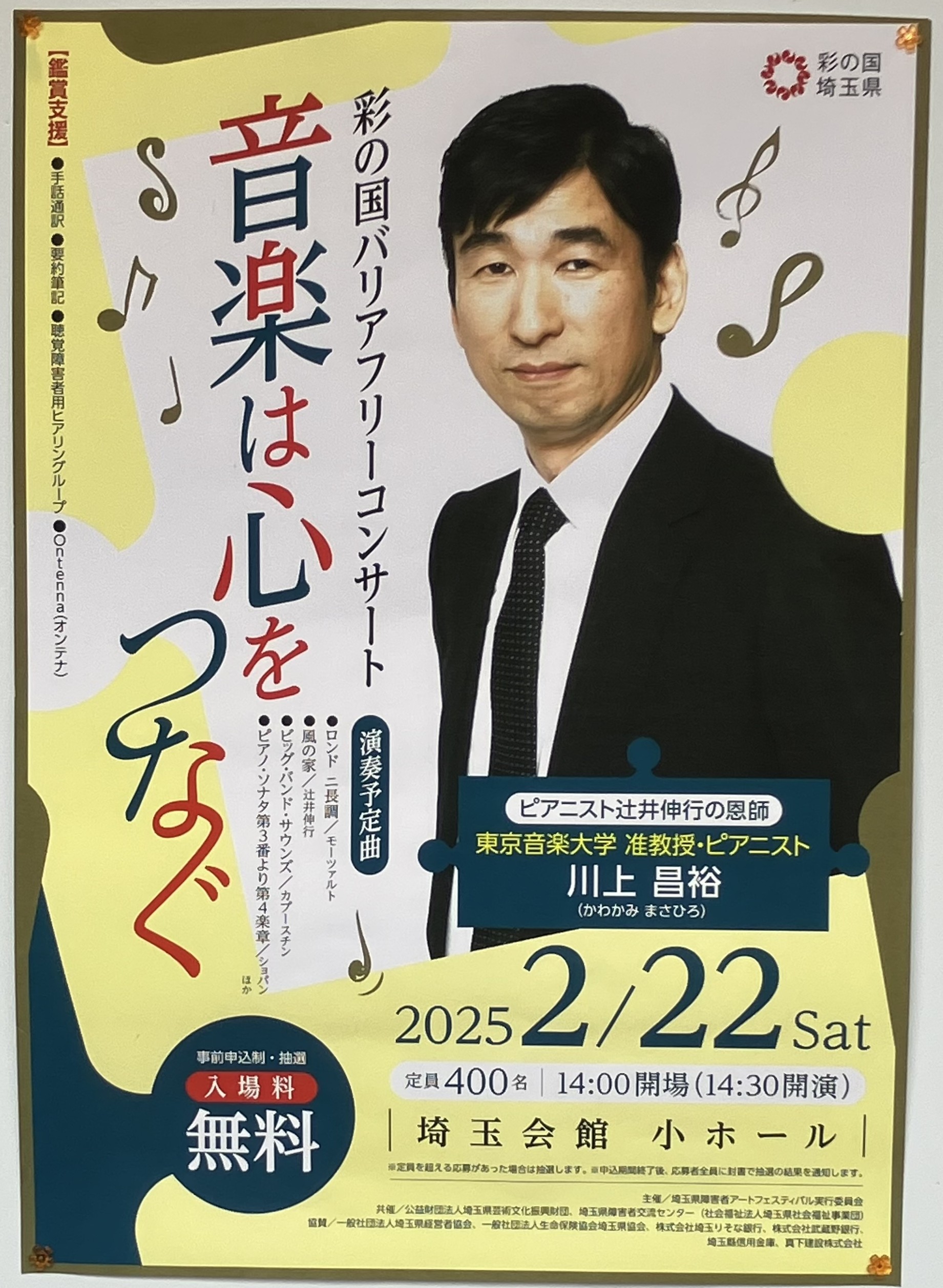障害のある方もない方も一緒にクオリティの高い音楽を気軽に鑑賞できる、彩の国バリアフリーコンサートが、2025年2月22日(土)、さいたま市浦和区の埼玉会館で開催され、古くからの友人を誘って出かけてきました。 主催は、埼玉県障害者アートフェスティバル実行委員会(担当:埼玉県庁・障害者福祉推進課)。 「今年度は『音楽は心をつなぐ』と題し、世界で活躍されている盲目のピアニスト辻井伸行氏の恩師でも知られる、東京音楽大学准教授でピアニストの川上昌裕(かわかみまさひろ)氏による演奏をお楽しみいただける。 (鑑賞支援として、手話通訳、要約筆記のほか、施設の床等にヒアリングループアンテナを設置し、マイクの音から変えた磁気を補聴器や人工内耳等が感知して直接音声を聞くことができるようにする仕組みを用意。 また、髪の毛や耳たぶなどに装着し)振動と光によって音の特徴を体で感じる『Ontenne(オンテナ)』の導入により、聴覚に障害のある方も臨場感あふれるコンサートを体感できる。」というものでした。 なお、埼玉県が作成した『共生社会づくりを目指す 心のバリアフリーハンドブック』が配布されました。 心や社会のバリアフリー、様々な障害に応じた配慮のポイント、事業者が留意するべき「合理的配慮」について、わかりやすく解説されています。 川上さんは、東京音楽大学ピアノ演奏家コースとウィーン市立音楽芸術大学を首席で卒業。 テレビやラジオへの放送出演多数。 古典から現代まで幅広いレパートリーを持ち、国内外でソロ・リサイタル、ピアノ・デュオ、室内楽、オーケストラとの共演など多くの演奏活動を行い、公開講座や公開レッスン、講演、楽譜出版、執筆など多方面に活動を展開されているとのことです。 今回のピアノ演奏は、モーツァルト・辻井さん・カプースチン・ショパンなどの楽曲を披露。 自由席の前から3列目だったので、両手と指による速弾きの様子がよく見えて、音の力強さと美しさに圧倒されました。 日頃の活動や各曲の解説などのさわやかなトークも楽しかったです。 川上さんが辻井さんのレッスンを行ったのは、小学生のときから。 視覚にハンディがある辻井さんのために、まずは、楽譜を読むテープを作ることに取り組みました。 曲を弾くのに必要な情報をどう伝え、考えてもらうかが課題だったそうです。 川上さんの優れた指導と、辻井さんの並々ならぬ才能・努力によって、世界的なピアニストが誕生したことがわかりました。 優しくおだやかに話される川上さんの、ピアノ演奏への熱い思いや強固な意志が感じられる素敵なコンサートでした。 終了後は、JR浦和駅近くの居酒屋へ。 友人と近況など話しながら、1対1、本音でわかり合うことの大切さを改めて思う、いい一日になりました。 2025年1月から、埼玉県熊谷市にあるシェア型書店「太原堂(たいげんどう)」における棚オーナーのひとりとして参加し、「虹色書店」の屋号で、好きな本の販売を始めました。 棚オーナーの皆さんや、お客様との交流によって、本と読書の世界を広げていきたいと考えています。 どうぞ、よろしくお願いいたします。 「太原堂」の公式ホームページは、こちらです。 ⇒ 「太原堂」 楽天ブログやSNS投稿をごらんいただいている皆様、いつもありがとうございます。 ⇒ 楽天ブログ「虹色のはるかな道 ~子どもの頃から好きだったこと~」 記事一覧 私の小さな旅や散歩、鉄道、読書、音楽、映画、特撮・怪獣、子どもの遊び、時事問題、各種講演会・セミナーの参加報告、そして、「13トリソミー」で生まれ0歳5か月でお空へと還っていった天使の拓海くんなどについてのフォトエッセイ『虹色のはるかな道』シリーズの最新刊『四季のお散歩旅 ~虹色のはるかな道6~』の紙の本が、Amazonに続いて、楽天ブックスでも発売になりました。 なお、Amazonでの電子書籍(kindle本)の発売につきましては、後日、お知らせします。 拙いものではありますが、ご興味がございましたら、どうぞよろしくお願いいたします。 ⇒ Amazonで販売 『四季のお散歩旅 ~虹色のはるかな道6~』 ⇒ 楽天ブックスで販売『四季のお散歩旅 ~虹色のはるかな道6~』私のInstagramは、こちらです。→ 友永孝浩 Instagram Facebookは、こちらです。→ 友永孝浩 Facebook Amazonでの紙の本→ 『雑誌感覚 ~虹色のはるかな道5~』 楽天ブックスでの紙の本→ 『雑誌感覚 ~虹色のはるかな道5~』 なお、Amazonでのみ販売されている電子書籍は、kindleという無料アプリをパソコンやスマホにダウンロードすれば、購入後、直ちに自身のライブラリに保存され、いつでも読むことができます。 文字や画像の拡大もOKです。 紙の本とはまたちがう味わいがあるかと思いますので、初めての方も、ぜひ電子書籍の世界を気軽にのぞいてみてください。 Amazonでの紙の本と電子書籍 → 『青空と白い雲の彼方 ~虹色のはるかな道4~』 楽天ブックスでの紙の本→ 【POD】青空と白い雲の彼方 虹色のはるかな道4 [ 友永 孝浩 ] 愛と幸せ