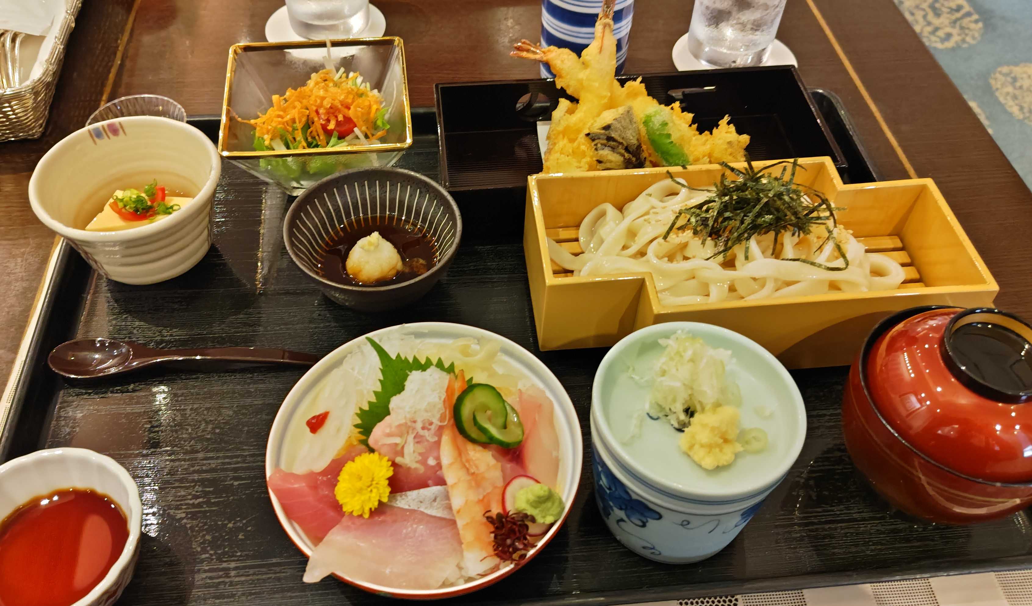 こちらのレストラン”セブンシーズ”は、和洋中いずれもチョイスすることができるので、迷いに迷って、「八種類の天ぷらときしめん?」といった感じのお料理をおねがいしました。