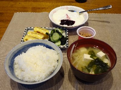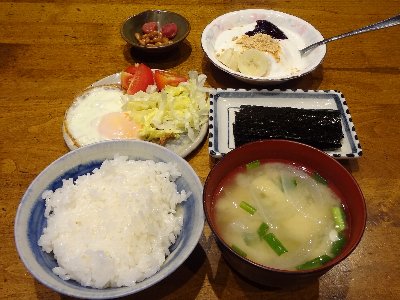 今朝はしらすから目玉焼き、納豆デザートにきなこ、ブルーベリー ヨーグルトとホントバラエティーに富んだ朝ごはんでしたいいですね愛情を感じます