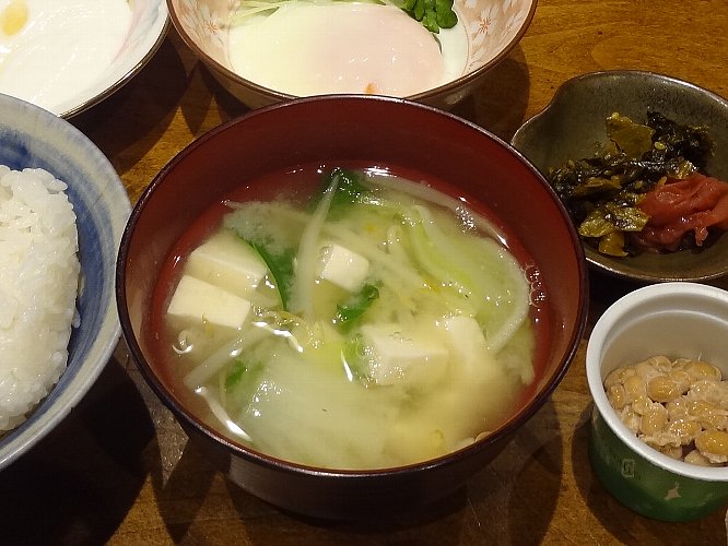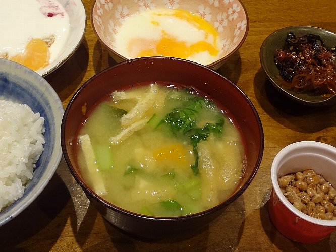 今日の朝ごはんは味噌汁に納豆、お漬物、温泉卵にヨーグルトでした毎朝 ほとんど同じメニューですが少しずつ変えていますこれが大切なポイントですね !