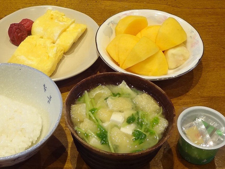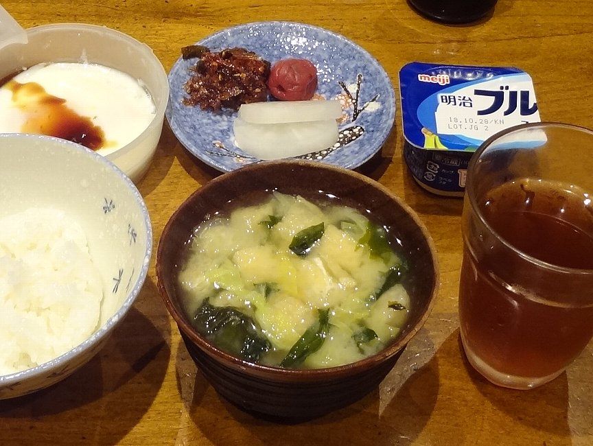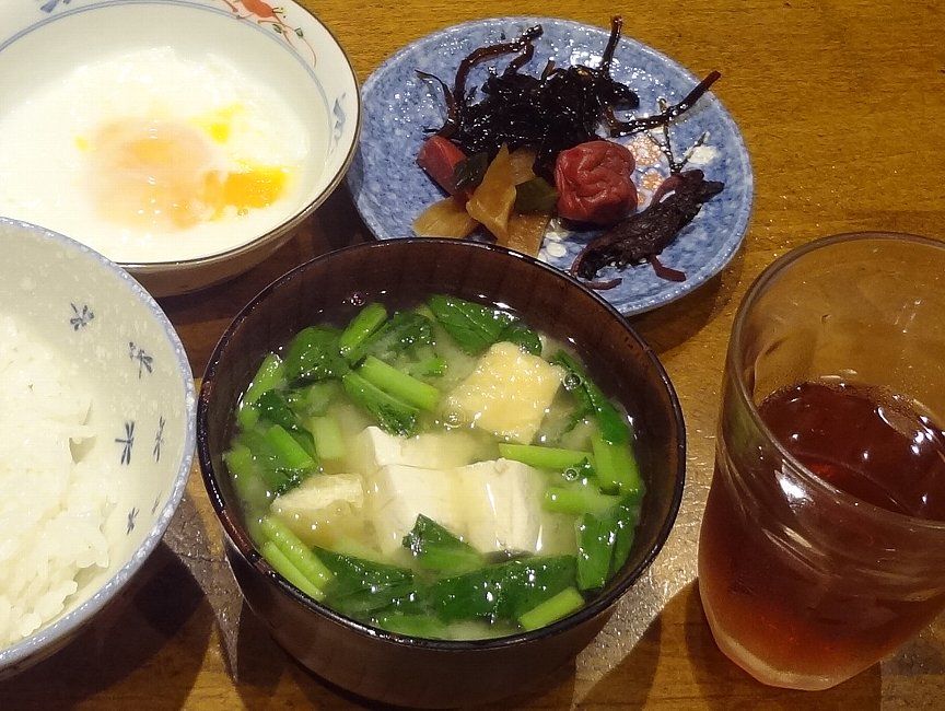 いつもの朝ごはんですが随分冷えてきましたからみそ汁の温もりで心が癒される感じです何となく ホッとしますね