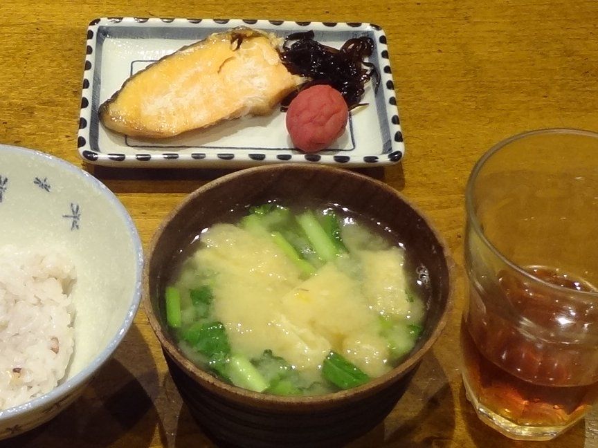 朝ごはんに鮭は合いますね塩味が効いているのでご飯が進みます最後の締めは梅干で酸っぱく仕上げて 今日の朝ご飯は終わりましたさあ 今日も元気よくスタートしました