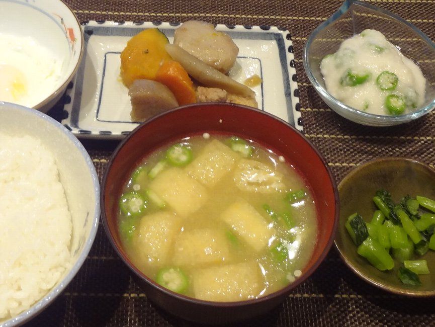 焼き魚に卵焼きオクラ山芋いい感じです落ち着く組み合わせと味わいでしたさあ 今日もやりますよ !