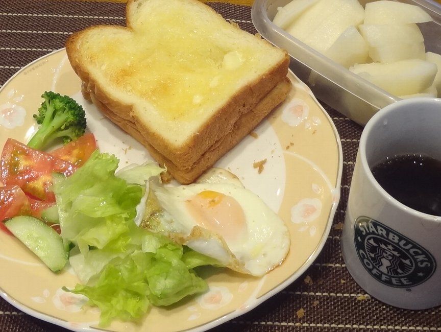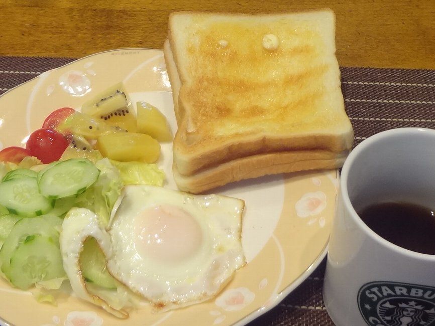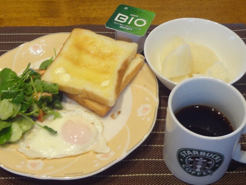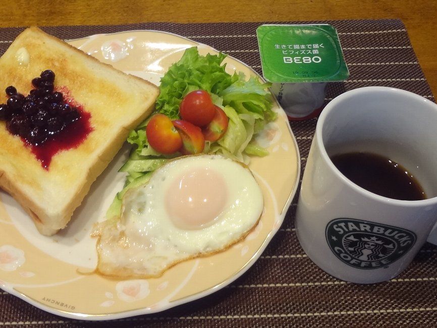 パンとコーヒーと生野菜と目玉焼きヨーグルトでバランスのいい朝ごはんですね家内に感謝します