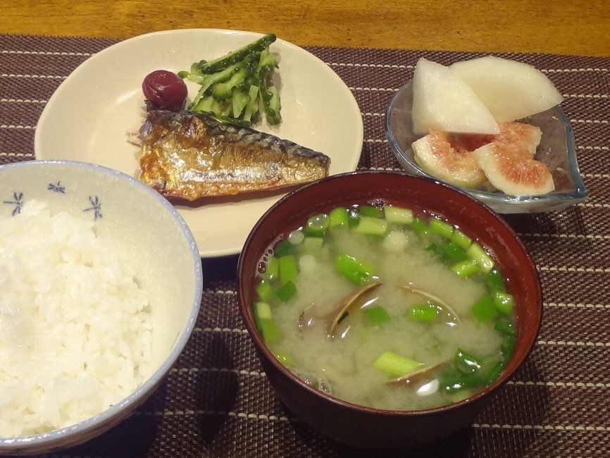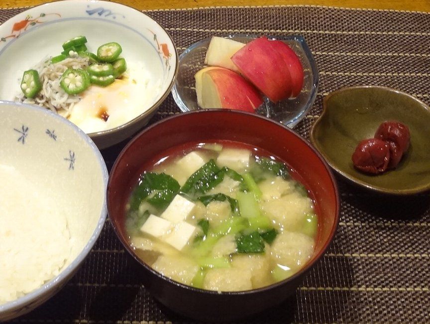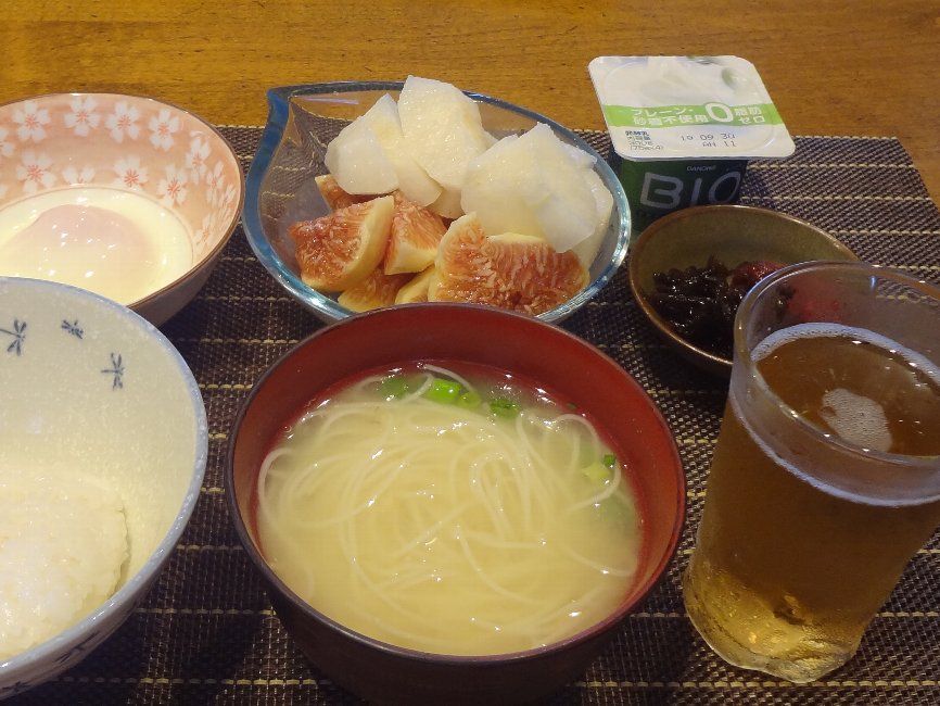 朝方が涼しくなりましたから温かいお吸い物で身体が癒されます卵に魚に佃煮、梅干し果物とバランスの取れた朝ごはんでなんとなく元気が出る感じですさあ 今日もやりますよ