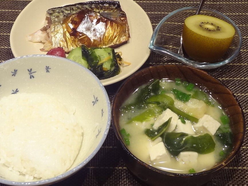 サバの塩焼きは朝ごはんに合いますね食が進みますデザートのキューイもいいですねなんとなく消化を助ける感じですさあ 元気をもらって今日も頑張ります !