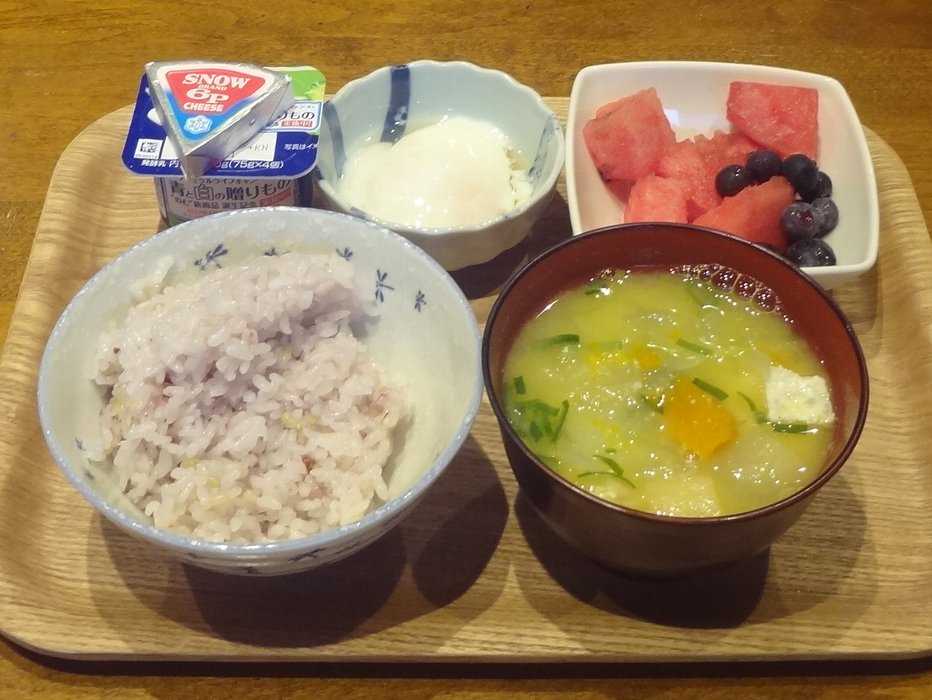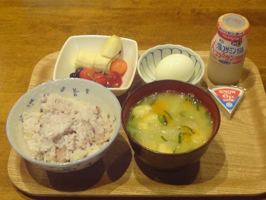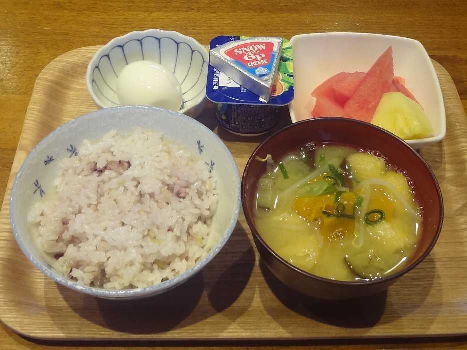 今日の朝たんぱく質は卵とチーズとヨーグルトでしたそれから雑穀ご飯とみそ汁とフルーツでしたとっても美味しかったです