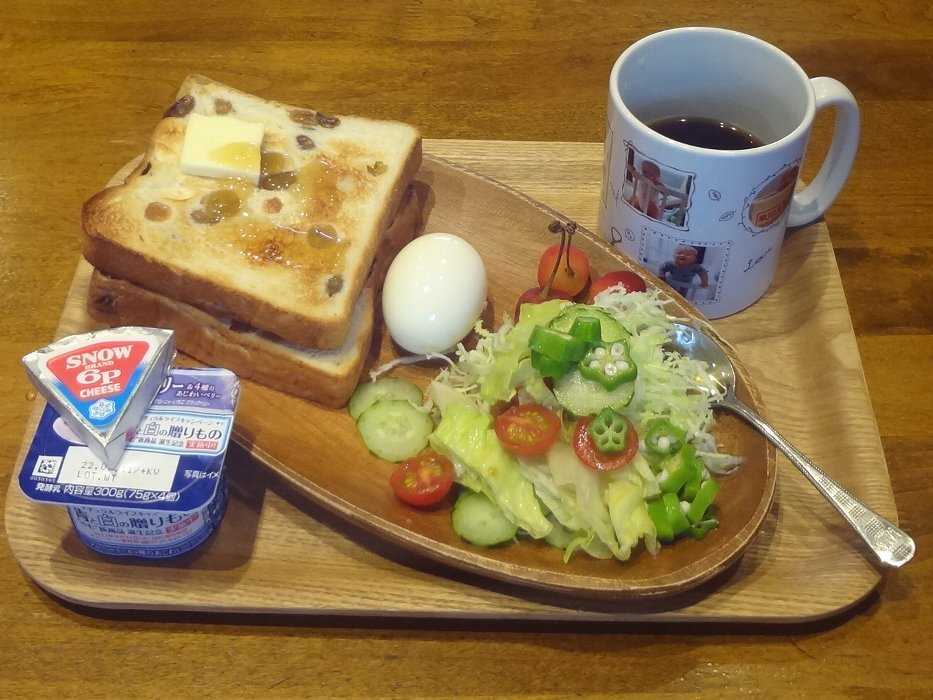 今日の朝たんぱく質は卵にチーズにヨーグルトでしたそれとレーズンパンとたっぷりの野菜でしたパンにはバターと蜂蜜をたっぷりと塗りました