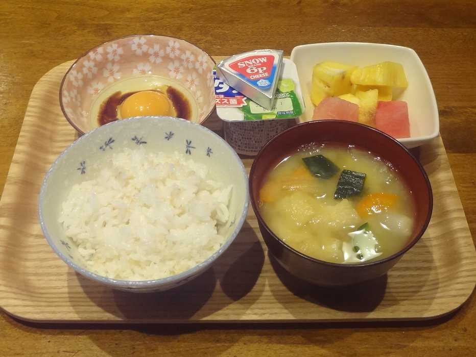 今日の朝たんぱく質は卵とチーズと乳飲料でしたそれからご飯とみそ汁、フルーツでしたいっぱい食べて 元気にスタートします