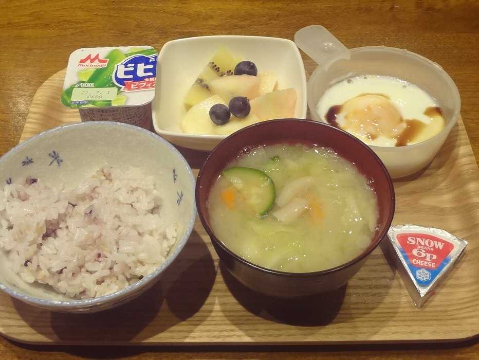 今日の朝たんぱく質は卵とチーズと乳飲料でしたそれからご飯とみそ汁とフルーツでしたとっても美味しかったです