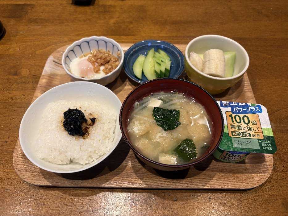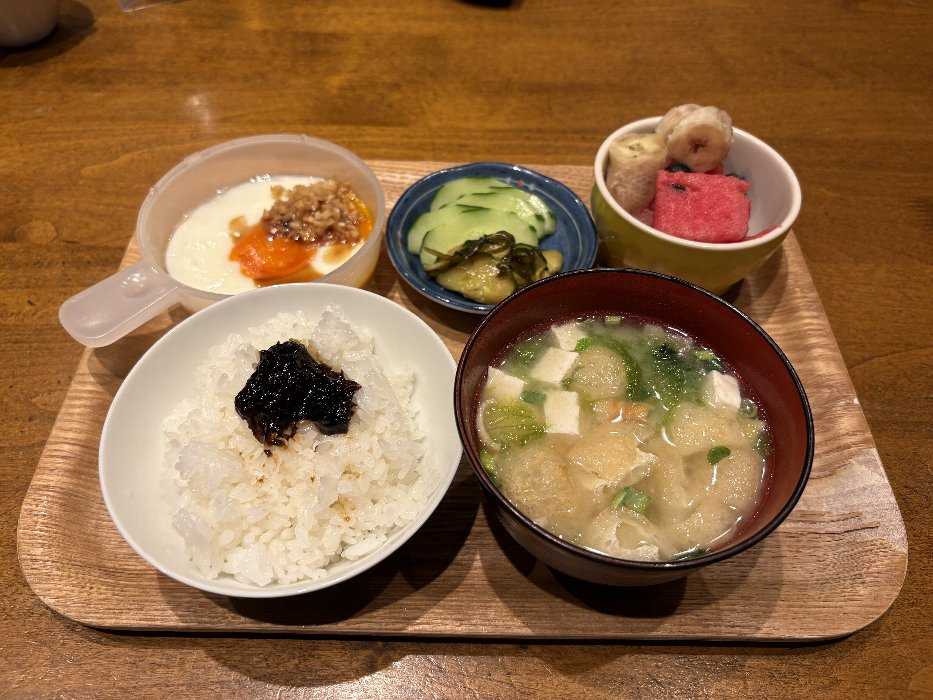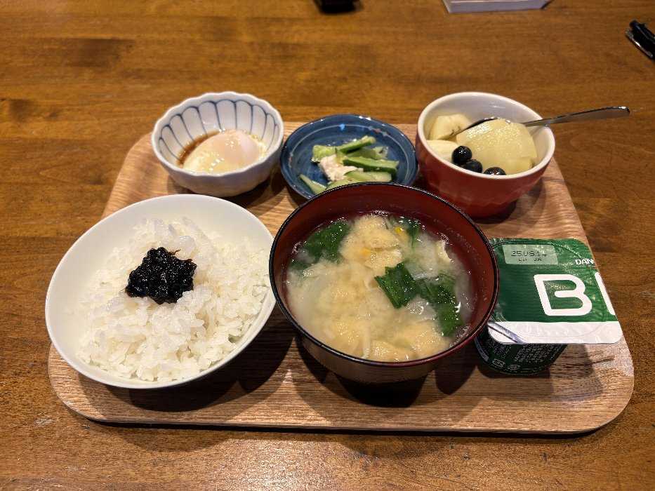 今日は白米のご飯に岩海苔をトッピングしていただきましたそれから温泉卵にしょうがのみじん切りお漬物、ブルーベリーとキューイフルーツとバナナヨーグルトの朝ごはんでした今日も元気にスタートしました