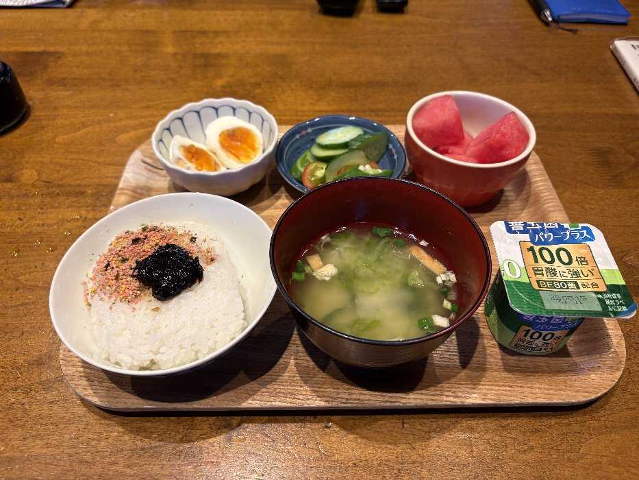 今日は白米のご飯に岩海苔をトッピングしていただきましたさらにふりかけをトッピングしましたそして ゆで卵、お漬物、スイカヨーグルトの朝ごはんでした今日も元気にスタートしました