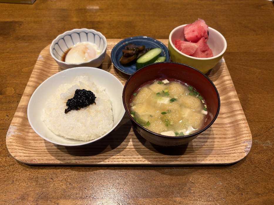 今日は白米に岩海苔をトッピングしていただきましたそれから温泉卵にきゅうりのお漬物スイカでした とっても美味しかったです今日も元気にスタートしました