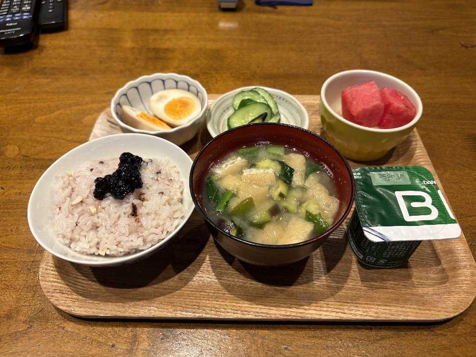 雑穀のご飯とゆで卵きゅうりのお漬物とスイカヨーグルトの朝ごはんでした今日も元気にスタートしました