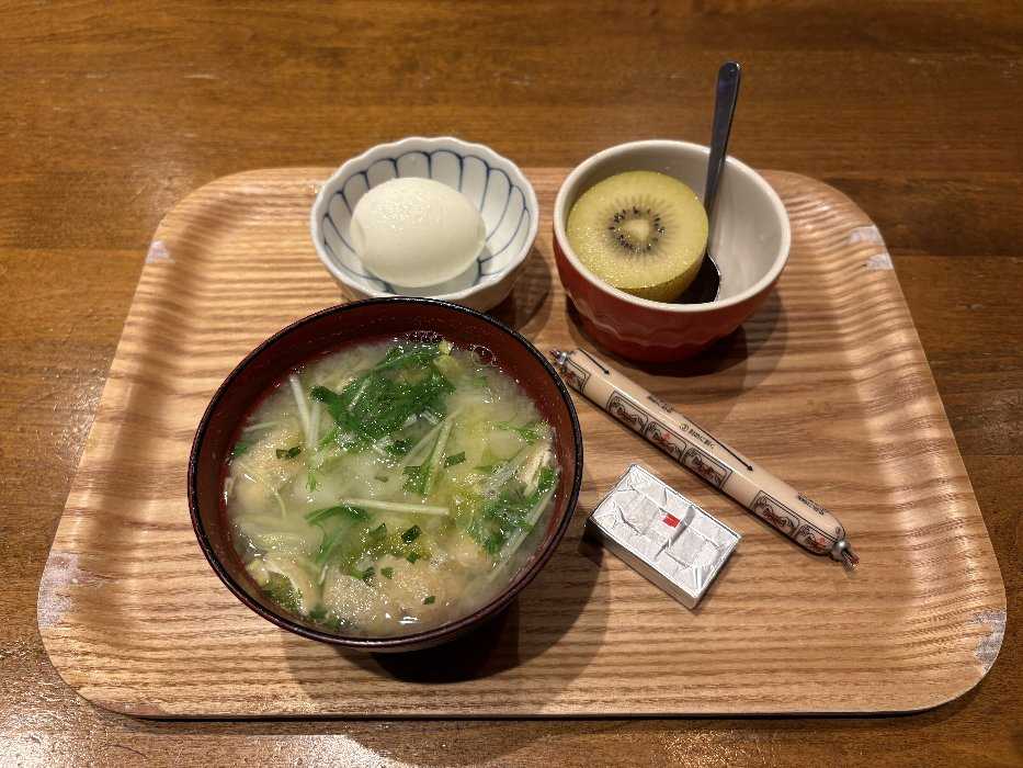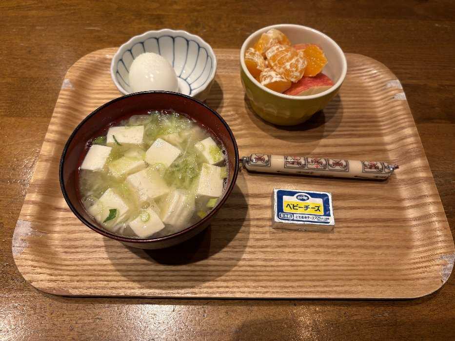 今日の朝ご飯はみそ汁とゆで卵、魚肉ソーセージ、チーズキューイフルーツでしたとっても美味しかったです今日も元気にスタートしました