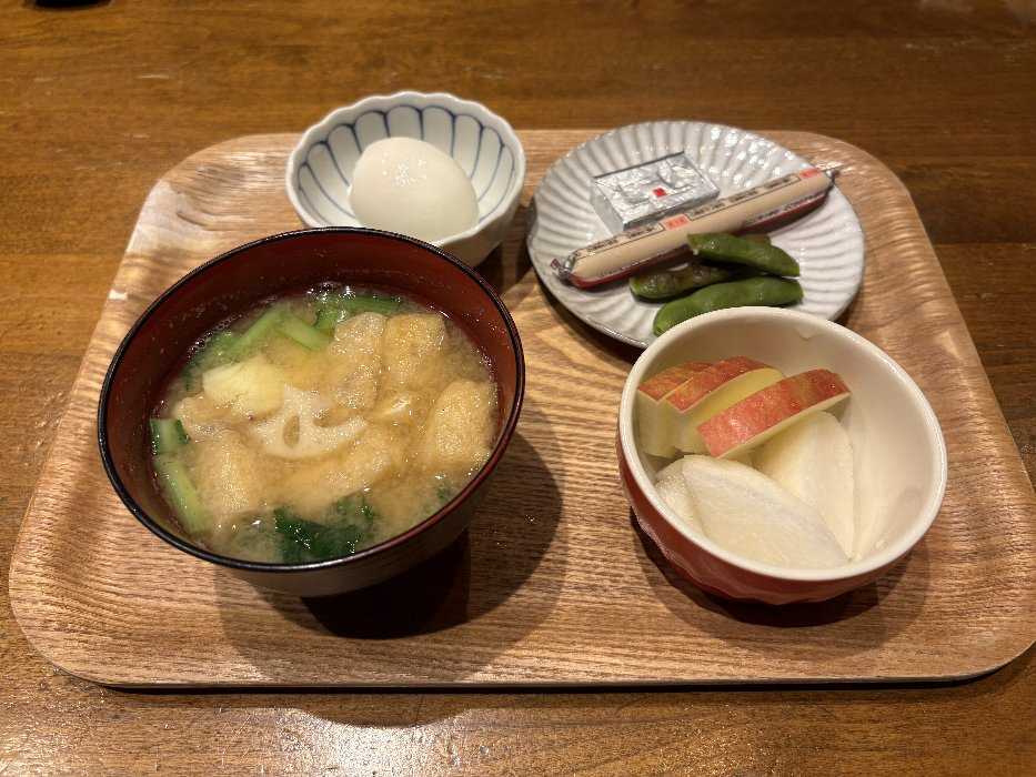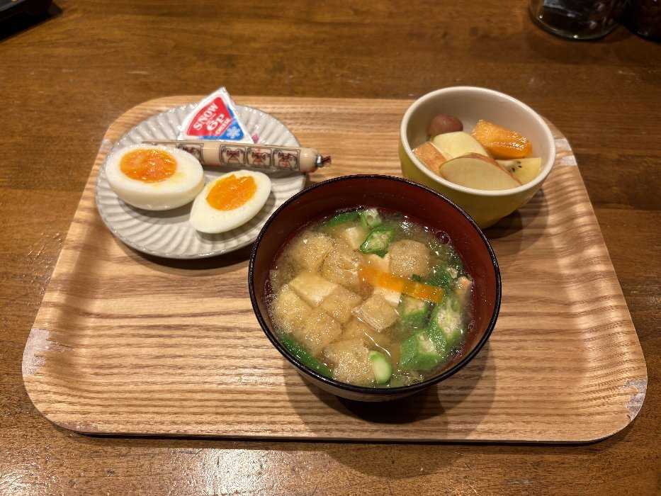 今日はみそ汁とゆで卵、枝豆、チーズ、魚肉ソーセージ梨とりんごの朝ごはんでした今日も元気にスタートしました