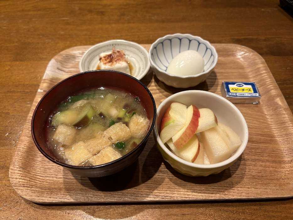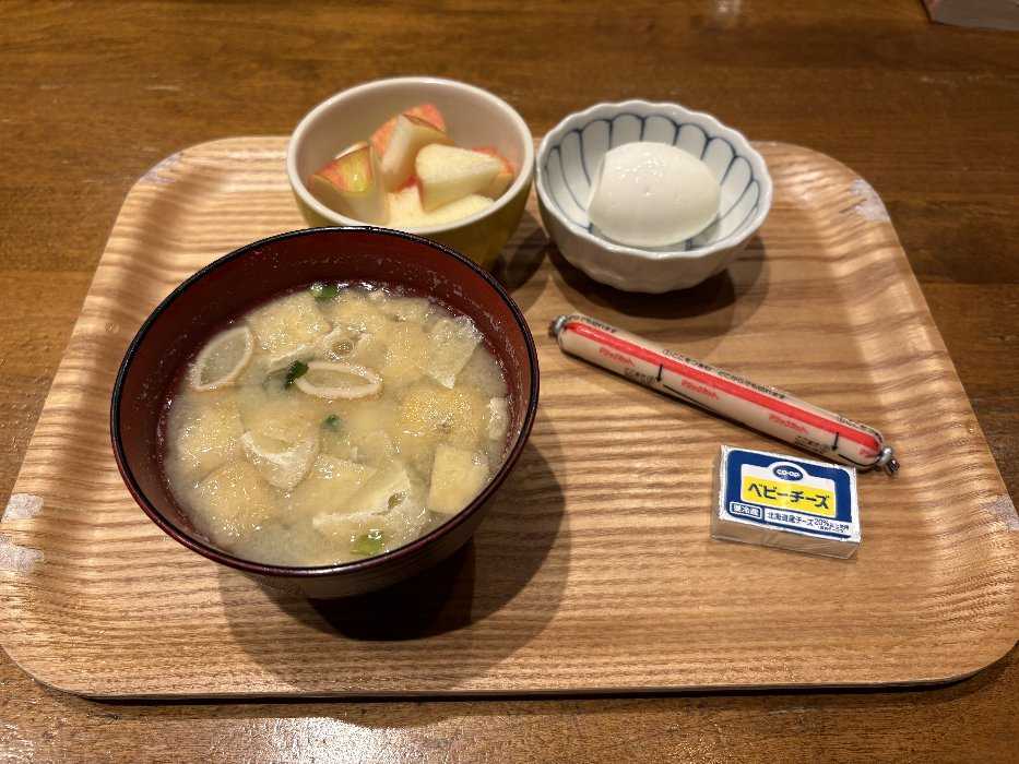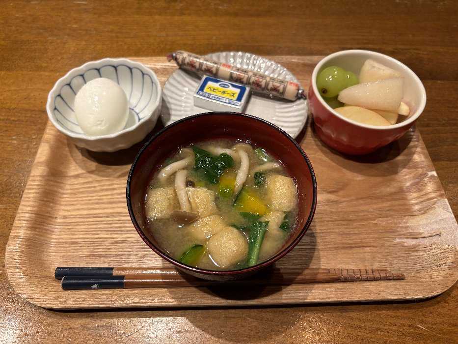 今日は味噌汁にゆで卵魚肉ソーセージ、チーズに梨、リンゴ、ブドウでしたとっても美味しかったです今日も元気にスタートしました