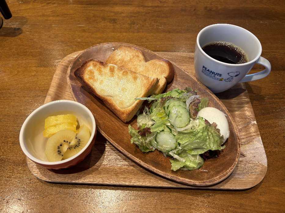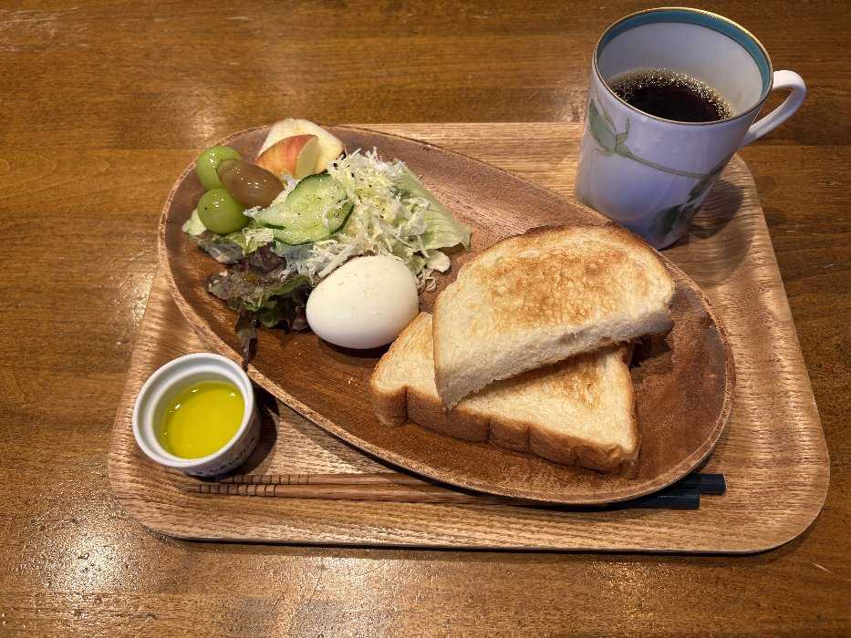 熱々のコーヒーと食パンにオリーブオイルを塗って食べましたとっても美味しかったです野菜にゆで卵、りんご、ブドウとバランスよく いただきました