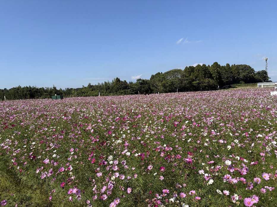 都城市の郊外にふれあい広場があります広大な敷地にコスモスが植えてありました隣にはサッカー場が3.4面、遊具施設もありましたしパターゴルフ場もありましたまさに市民の憩いの広場でした