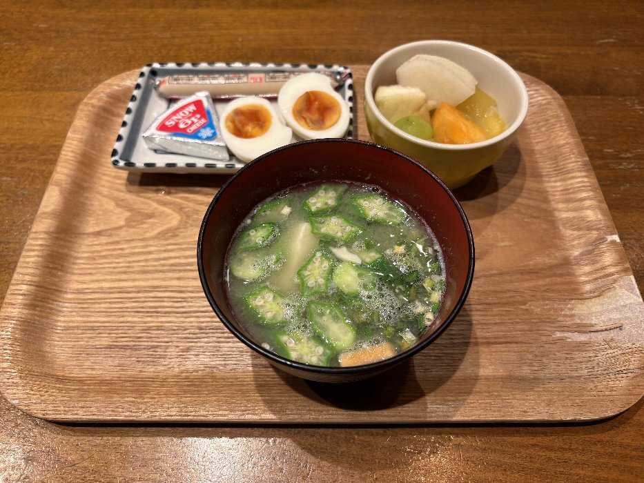 今日はお味噌汁にゆで卵、チーズ、魚肉ソーセージ柿、梨、ぶどうのデザートでしたとっても美味しかったです今日も元気にスタートしました