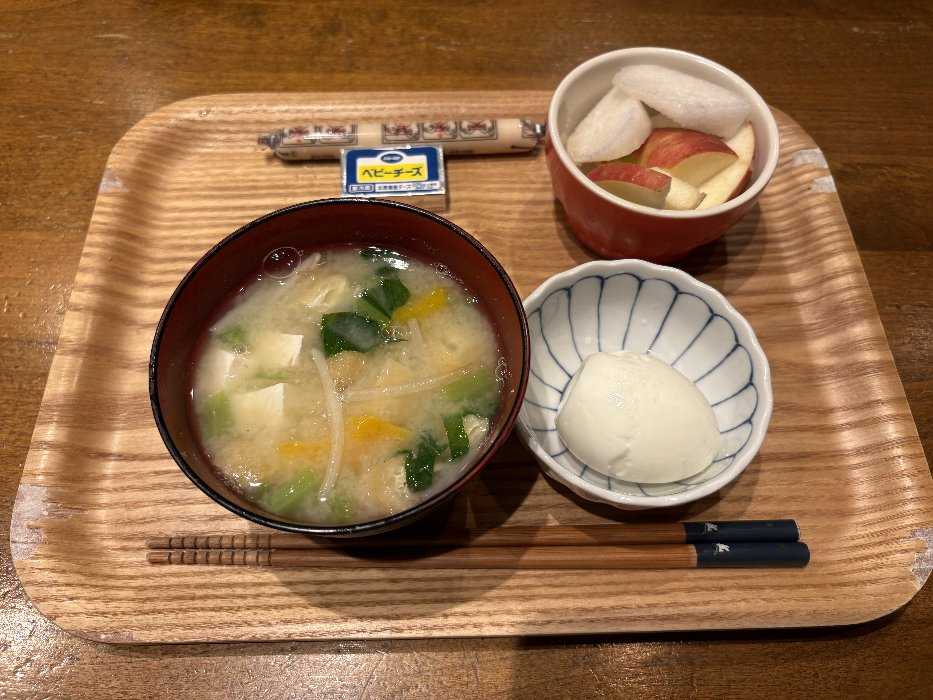 今日の朝ごはんはみそ汁とゆで卵に魚肉ソーセージ、チーズリンゴでしたとっても美味しかったです今日も元気にスタートしました