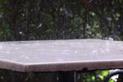 大粒の雨が降ってきたので庇の下の席へ